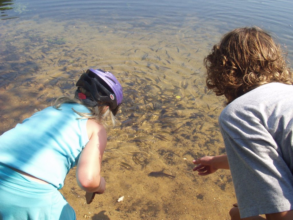 Michael Carly Katie at Ruth's Pond feeding fish 2007